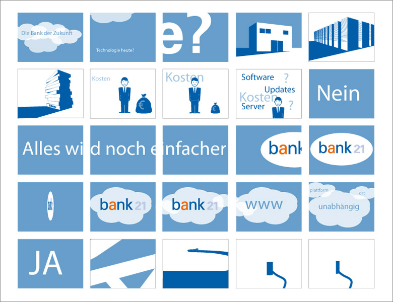 Zur Eröffnung des Innovationsforums setzte SNT Media das Thema „bank21“ als Trickfilm für eine Großbildprojektion um. Der Film sollte ohne Ton alle Informationen zum Thema spielerisch vermitteln.